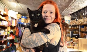 Stacy Rapp, a witch and owner of Enchantments, with a resident cat. Photograph: Simon Leigh for the Guardian