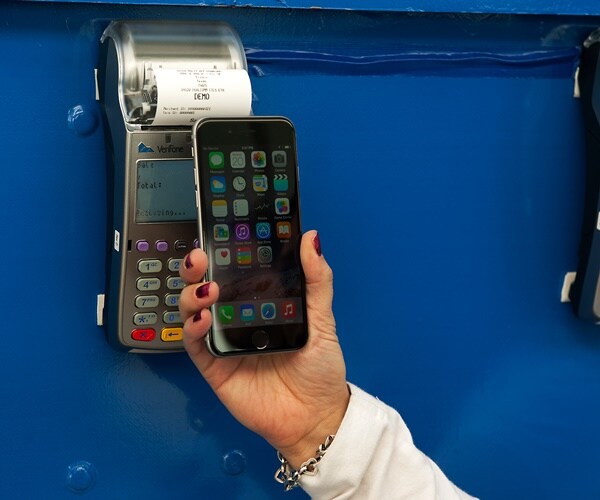 Ursula Anderman teaches New York pedestrians how to use Apple Pay, as part of a Visa/Chase promotion, Oct. 20, 2014 in New York. (Bryan Thomas/Getty Images)