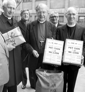 The Archbishop of Westminster Basil Hume, left, the Archbishop of Canterbury Dr Robert Runcie, centre, and the moderator of the Free Church Federal Council Dr Ronald English outside the Home Office in 1986, with a sackful of petitions signed by nearly 800,000 Christians to Keep Sunday Special. Photograph: PA