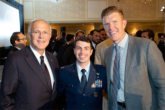 Supreme Knight Carl Anderson and Matt Birk, a 15-year veteran of the National Football League, and Super Bowl XLVII champion, who was the conference’s keynote speaker, with Captain Julian Gluck of the United States Air Force. Capt. Gluck, past grand knight at the United States Air Force Academy Council 8200, received the inaugural Distinguished Alumnus Award.
