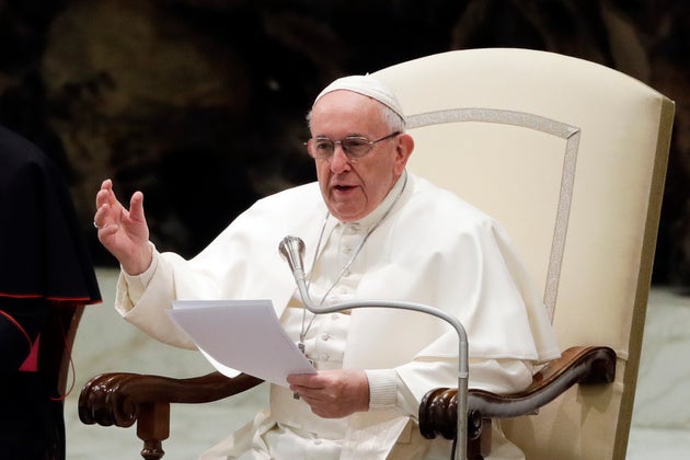 Pope Francis, who is traveling to the Arabian Peninsula on Sunday, delivers a speech at the Vatican on Jan. 30, 2019. (ASSOCIATED PRESS)