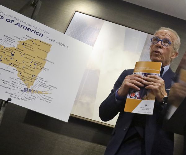 Attorney Jeff Anderson holds a list of names, during a press conference, of more than 130 Boy Scout leaders who worked in New York and were named in Boy Scouts of America (BSA) "Perversion Files" as having allegations of sexually abusing minors in New York. (Bebeto Matthews/AP)