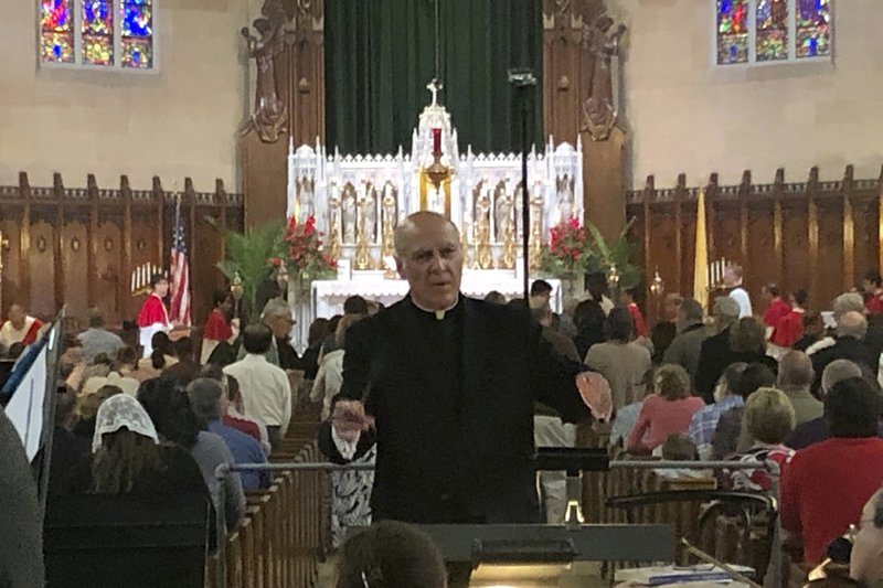 In this June 9, 2019 photo, Father Eduard Perrone conducts a choir during mass at Assumption of the Blessed Virgin March Parish in Detroit. The Roman Catholic Archdiocese of Detroit said Sunday, July 7 that it has removed Perrone from public ministry after receiving what it described as a "credible allegation" that he had abused a child decades ago. (AP Photo/Paul Sancya)