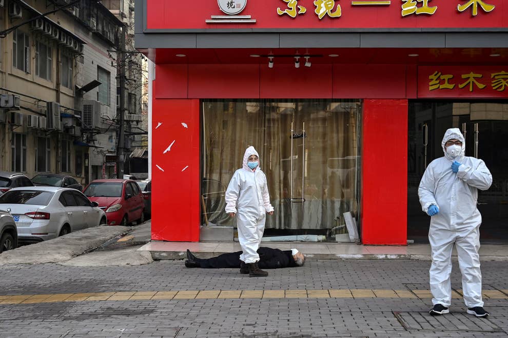 Officials protective suits check on an elderly man who collapsed and died on a street near a hospital in Wuhan, Jan. 30.