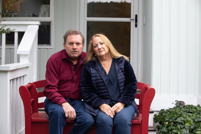 Jim Owen and Carolynn Comstock, singers in the Skagit Valley Chorale, sit outside their home in Anacortes, Wash.