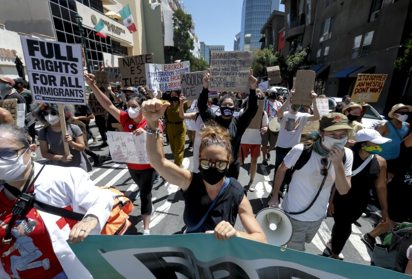 Ambre Decilap, center, marches Saturday calling for the closure of the Otay Mesa Detention Center in San Diego.