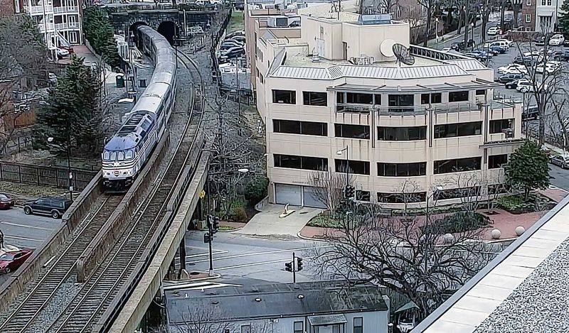 A commuter train runs past the Democratic National Committee building on Jan. 6, 2021, while a pipe bomb rests under a park bench behind the DNC.U.S. Capitol Police