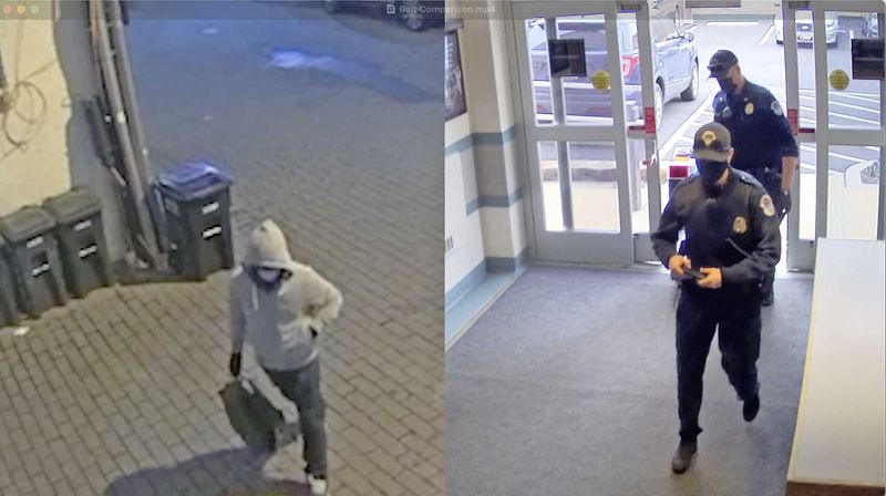 An expert in gait analysis used a computer algorithm to compare the gait of the pipe-bomb suspect (left) to that of Officer Shauni Rae Kerkhoff and obtained a 94% match.FBI/U.S. Capitol Police