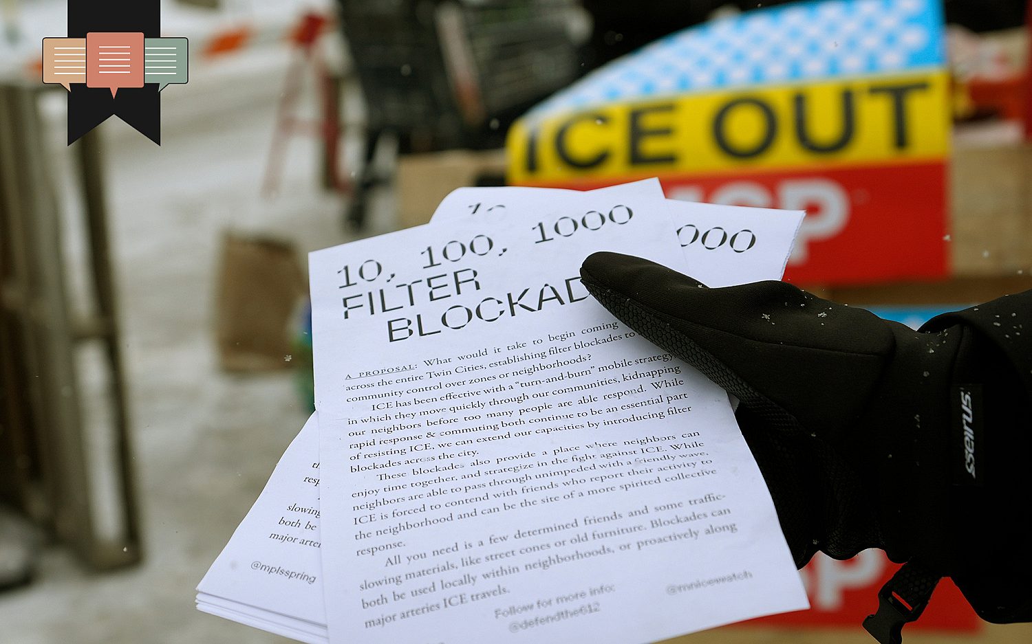 Activists hand out flyers to motorists at a blockade set up to deter ICE vehicles in Minneapolis on Sunday.Associated Press / Photo by Alex Brandon